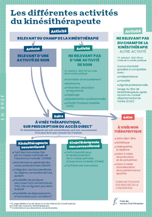 Afin d’accompagner les kinésithérapeutes dans l’ensemble de leurs activités, l’Ordre a réalisé une infographie ayant pour objectif d’apporter une lecture claire et structurée des différentes activités susceptibles d’être exercées.